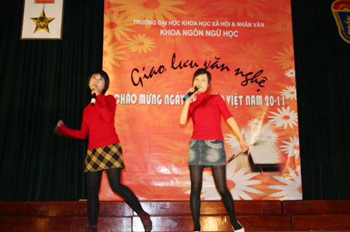 Buổi tối cùng ngày, một chương trình giao lưu văn nghệ đặc sắc do LCĐ và LCH khoa Ngôn ngữ học tổ chức nhằm tri ân các thầy cô đã diễn ra tại hội trường tầng 8 nhà E, bao gồm nhiều tiết mục đặc sắc không chỉ của sinh viên Việt Nam mà cả của các sinh viên Trung Quốc, Hàn Quốc đang học tập tại Khoa Ngôn ngữ học. Những ca khúc Việt Nam sâu lắng về tình cảm thầy trò, kỉ niệm về mái trường hoà cùng những điệu nhảy sôi động, lôi cuốn của các sinh viên Trung Quốc, Hàn Quốc. Đặc biệt bài hát quen thuộc “Bụi phấn” đã được các sinh viên Trung Quốc biểu diễn rất thành công như là lời tri ân chân thành nhất của mình dành cho các thầy cô. PGS.TS, nhà văn Hữu Đạt, giảng viên của Khoa Ngôn ngữ học đồng thời là tác giả của nhiều bộ tiểu thuyết, kịch bản sân khấu và điện ảnh (gần đây nhất là kịch bản bộ phim truyền hình “ Cổng trường thời mở cửa”) cũng góp vui với đêm giao lưu văn nghệ bằng tiết mục biểu diễn độc tấu đàn bầu “ Xe chỉ luồn kim- dân ca quan họ Bắc Ninh” rung động lòng người..